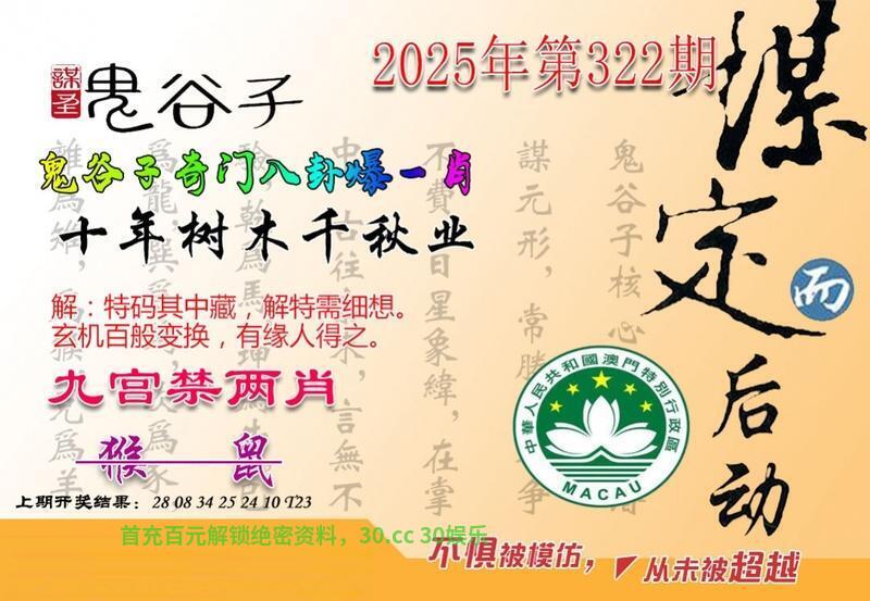 ╠解鬼谷子╣322期:“十年树木千秋业”这句话原本的意思是十年栽种一棵树,百年成就一番事业。而“十年树木”指的是龙在十二生肖中的排行第十一位,代表着种植和成长,同时也寓意着长期的努力和积累才能取得巨大的成就 |